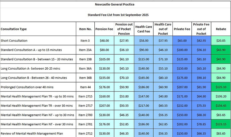 We are a Private Practice therefore we do not bulk bill our patients. We prefer all fees to be paid at the time of consultation. Our practice full fee schedule is listed below. Payments can be made by cash, cheque, Credit Card, or EFTPOS. Our staff can send patient claim information directly to Medicare Online through a secure internet connection.